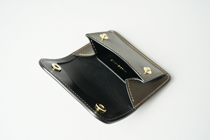 前回の#4に引き続き、今回のシリーズでも内装にはサドルプルアップのブラックを組み合わせています。そして、糸色にライトブラウンのステッチを採用しています。この糸使いによって、外装のダークコニャックとは同系統の色合いで控えめで落ち着いた印象なのに対し、内装のブラックでは一転してメリハリの効いたビビッドな表情を形成します。また、ロゴにゴールドカラーの箔押し、さらに全てのアイテム共通で金具にもゴールドカラーのパーツを採用しています。限定アイテムならではの特別な仕様により、高級感が漂うアイテムに仕上がりました。続いてラインナップのご紹介です。