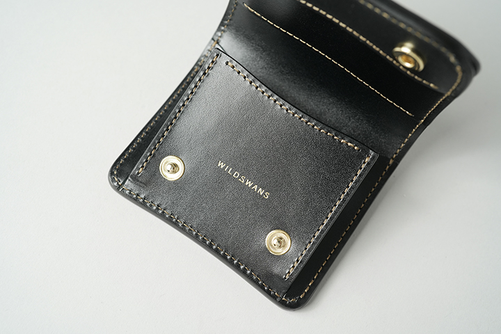 フラップを開くとダークコニャックの大きな前身が現れます。WILDSWANSのロゴは、フラップ背面に刻印されています。