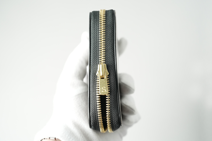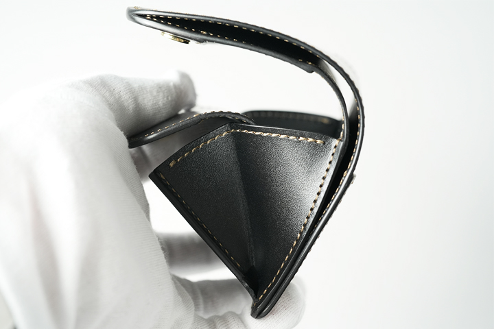 メイン収納の内部には革の仕切りを設けていますので、コインを前身側に入れて仕切りの奥にカードや折りたたんだ紙幣を収納することができます。この仕切りにうっすら光るゴールドの刻印をご覧頂けますでしょうか。先ほどのブランドロゴは、この仕切りに刻印されています。