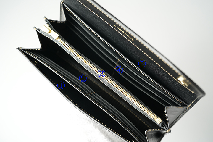 ① 、⑤・・・マチなしのスペース。紙幣や領収書の収納を想定しています。