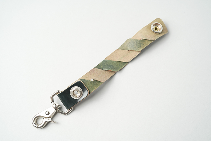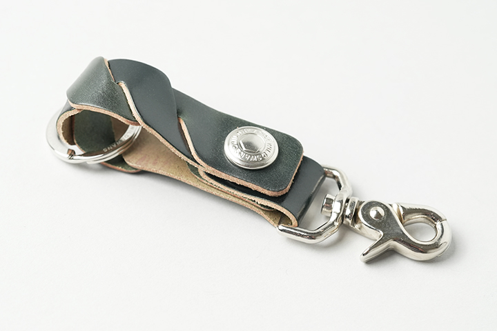 WILDSWANSではお馴染みのキーホルダー。縫製を施さないため、本体にステッチはありません。編み込んだ革と金具のみでつくられたワイルドな仕様です。