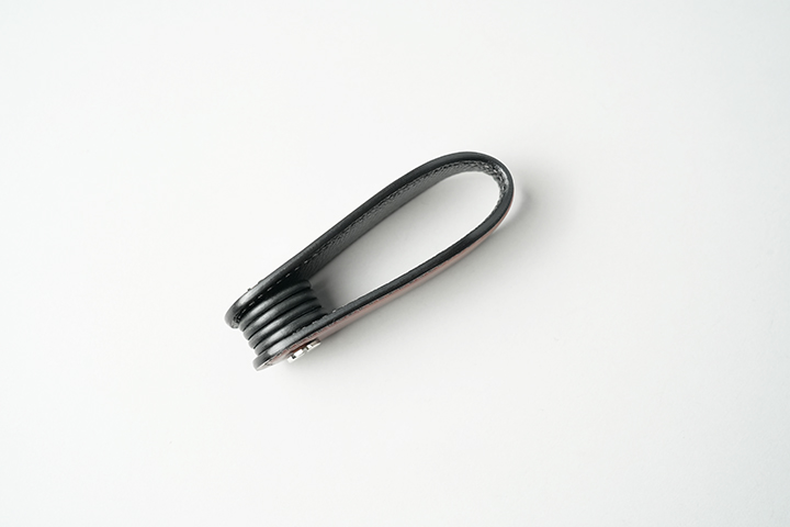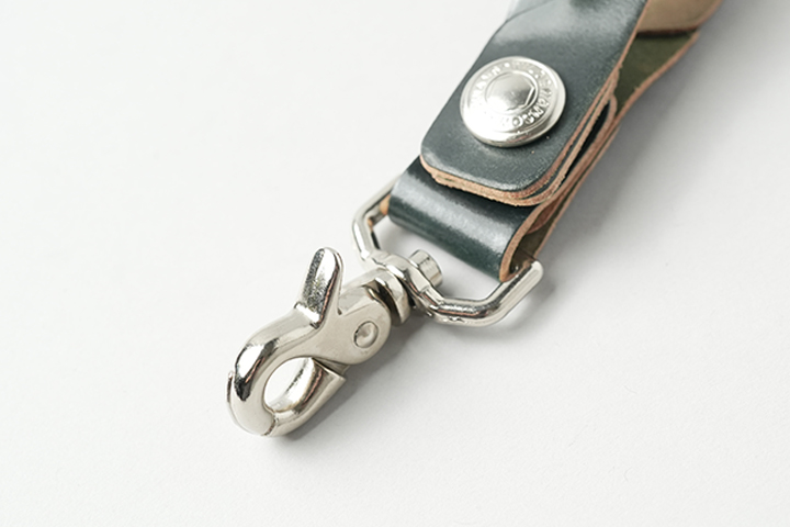 折り曲げ部分は、本体よりも幅をやや狭めることで、金具の取り付けに適した形状にしています。WILDSWANSのカラビナキーリング(画像のLサイズまたはMサイズに対応)を取り付けることで、携帯性が高まります。