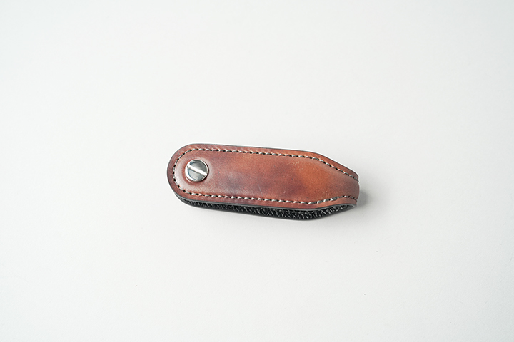 スライサーは、本体の内側と同様に型押しサドルプルアップのブラックで製作しています。画像のように、カギとスライサーを交互に挟むようにして装着し、最後に留め具のネジを締めて完成です。カギの枚数によって、スライサーの量や配置を調整してお使いください。