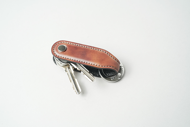独特のアイデアが取り入れられた、新しいかたちの小型キーケースです。カギを包み込むように収納する一般的な仕様ではなく、革パーツでカギをサンドするようなイメージでお使いいただきます。