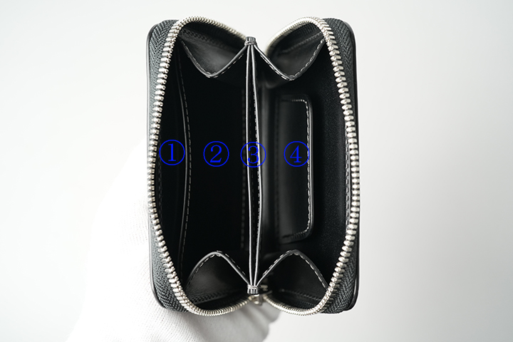 ファスナーを開けると、機能と形状が異なる4つの収納部が露わになります。 ③のマチ無しポケットを境に、 ②と④のメインスペースと、 ①のマチ無しポケットが設けられています。 タイトな空間からマチ式のメインスペース、ベロパーツ(革の仕切り)に至るまで備わっていますので、収納に際して非常に応用が利くアイテムです。