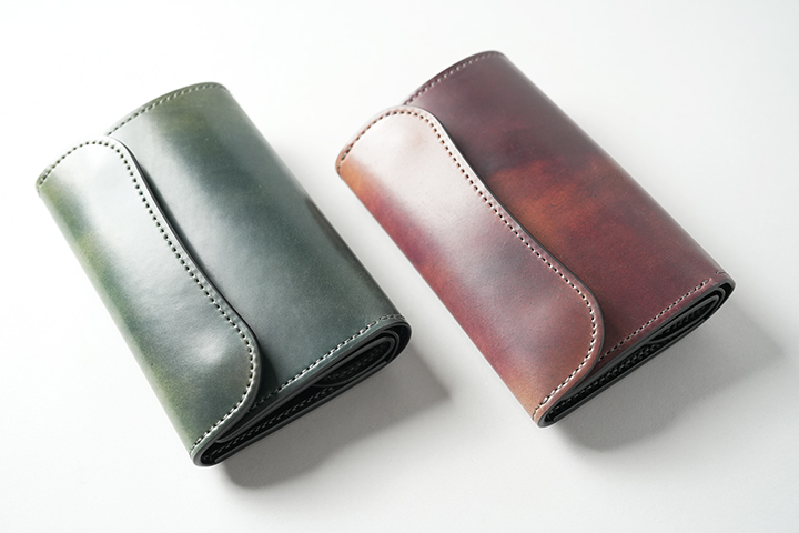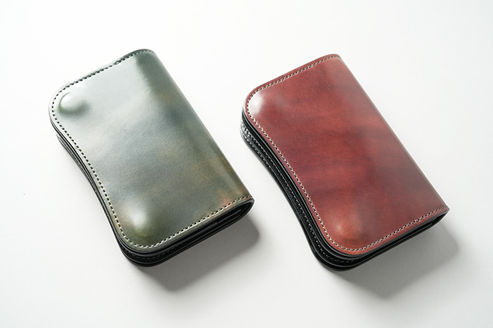 新品時に感じるコロンとした膨らみは、使用を重ねるにつれ落ち着きます。画像左はスタッフが約1年使用したシェルコードバン/#8のENOです。画像右には、今回発売するシェルコードバンマーブル/#8のENOを並べています。革の種類や使用環境によって変化の度合いは異なりますが、使い込むことでより携帯性が高まることが分かります。
