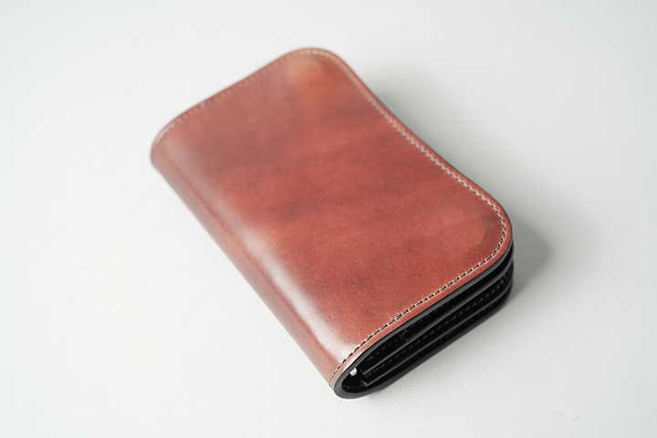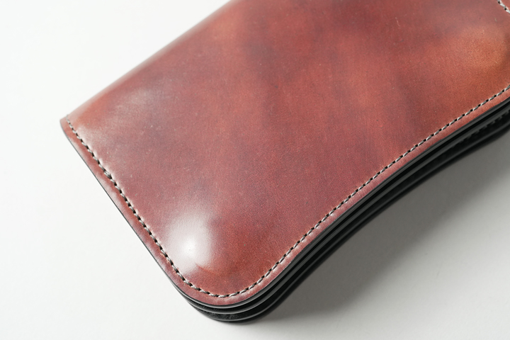 ENOよりも一回り大きいBYRNEは、より一層革の迫力と存在感を堪能できるアイテムです。断面から覗くコバは層のように重なり、職人の技巧が節々に感じ取れます。