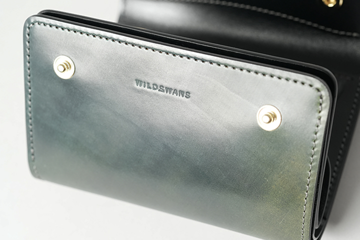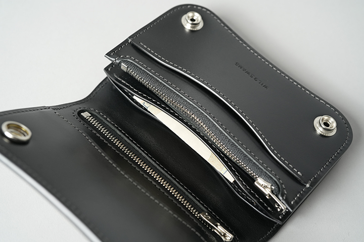 外周のファスナーにはYKK社のエクセラを使用し、滑らかな使用感と高い耐久性を実現しています。引手にはWILDSWANSのロゴがさりげなくあしらわれ、鋭く光るシルバーカラーが全体の雰囲気を引き締めます。
