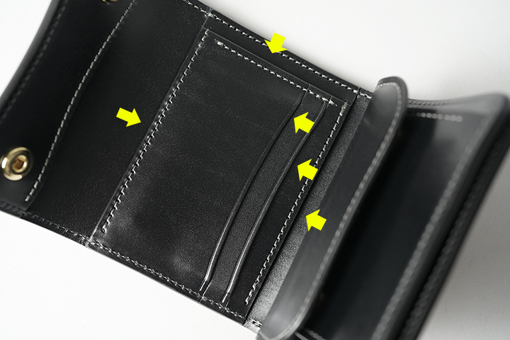 ③のマチ無しポケットはしっかりと深さが確保され、二つ折りの紙幣が収まるのが嬉しいポイントです。