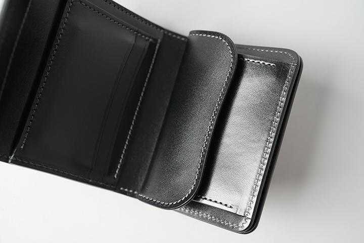 三つ折り財布の板面を活かし、札室はゆったりとした設計です。紙幣やレシートの出し入れも円滑に行えます。