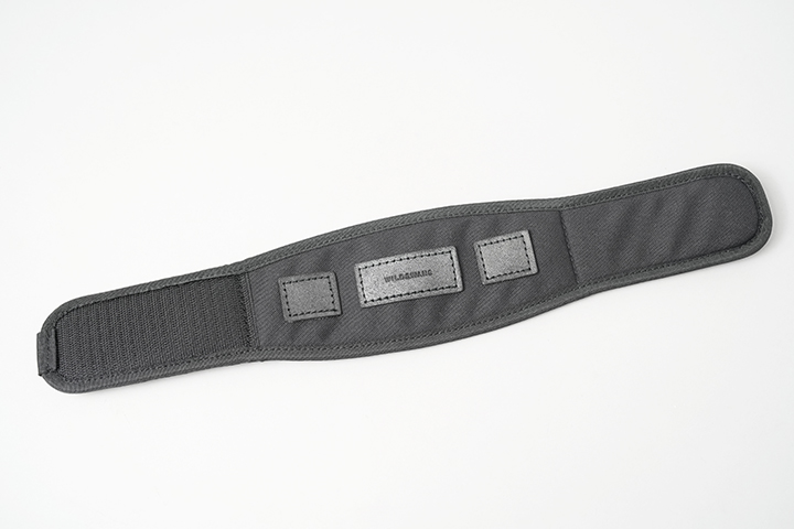 帯の背面は、実際足首に接することからレザーパーツなどの装飾はありません。また、適度なハリ感とフィット感を出すために帯の生地内部には心材を挟んでいます。