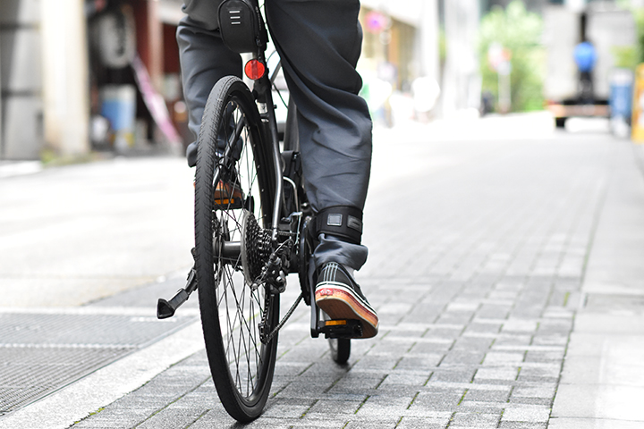トラウザーズストラップは、ロードバイクやクロスバイクなどチェーンがむき出しの自転車に乗る際に、チェーンの衣類(パンツ)への干渉を防止するために開発されました。チェーンの汚れや巻き込みから衣類を守りながら、アクティブな運転シーンをサポートします。