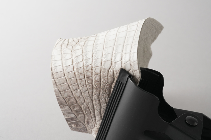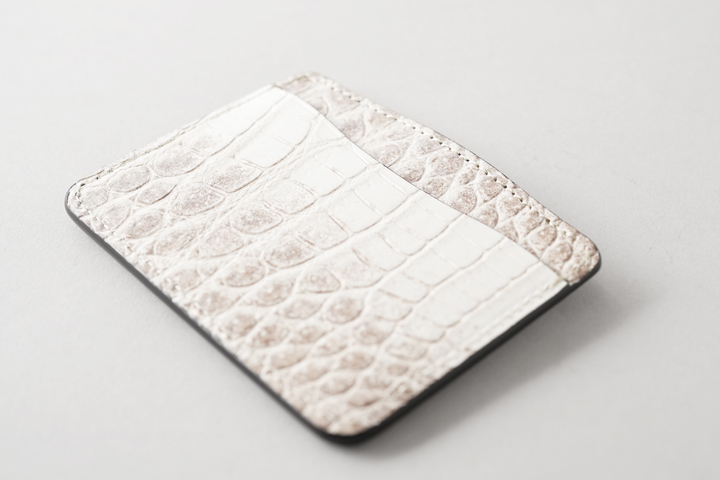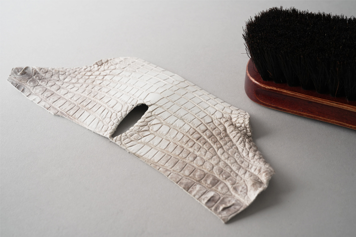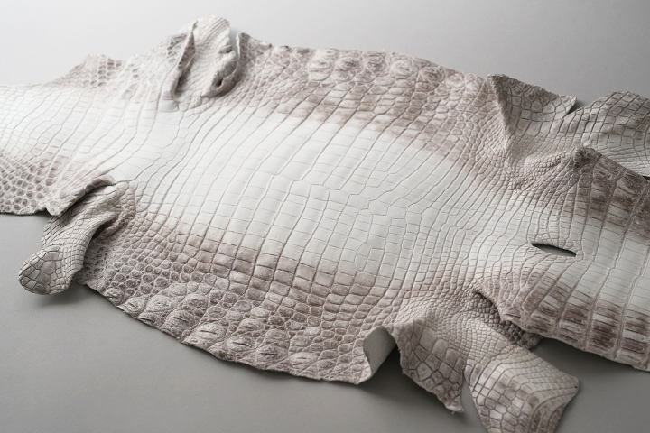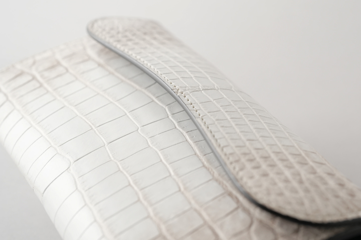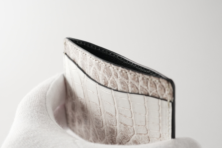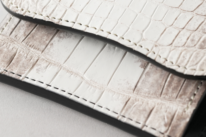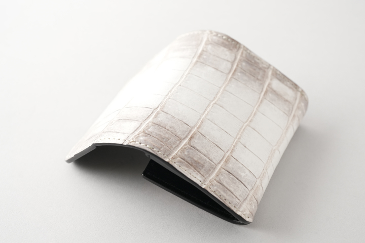 意外に思われるかも知れませんが、ヒマラヤクロコは白い顔料で塗装されたものではなく、皮革の色味を活かして製造されており、染色や塗装は行われていません。 よって原皮の持つ表情がダイレクトに皮革に現れることとなり、厳選した原皮を用いる必要があります。また鞣しの工程も一般的なクロコダイルよりも手間が掛かることによって、その美しさと希少性から高級皮革として珍重されています。