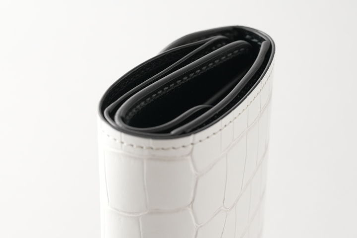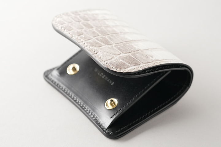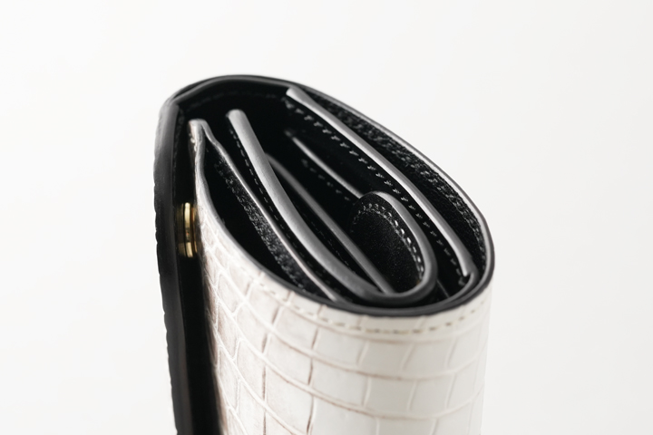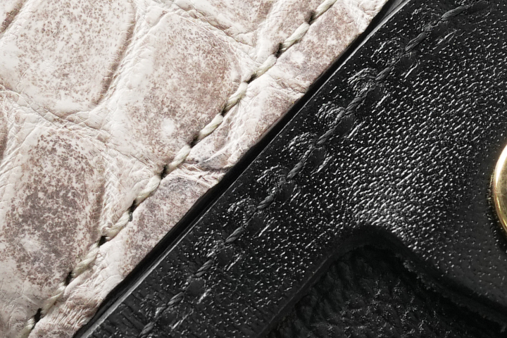 皮革のカラーに合わせた仕様ですが、構造上(表裏が同じ色味の皮革の場合など)クロコダイル部分に黒いステッチで縫製される部分があります。また、部分的に反対側のステッチが見えることがございますこと、予めご了承下さいませ。