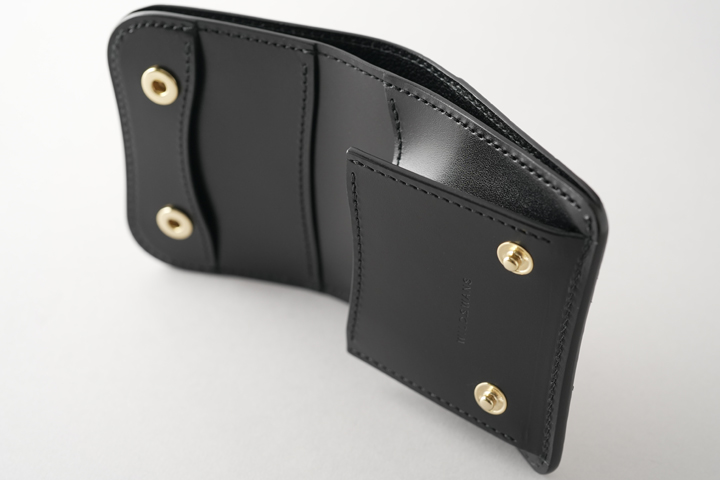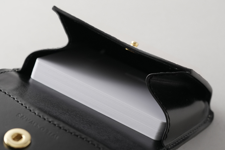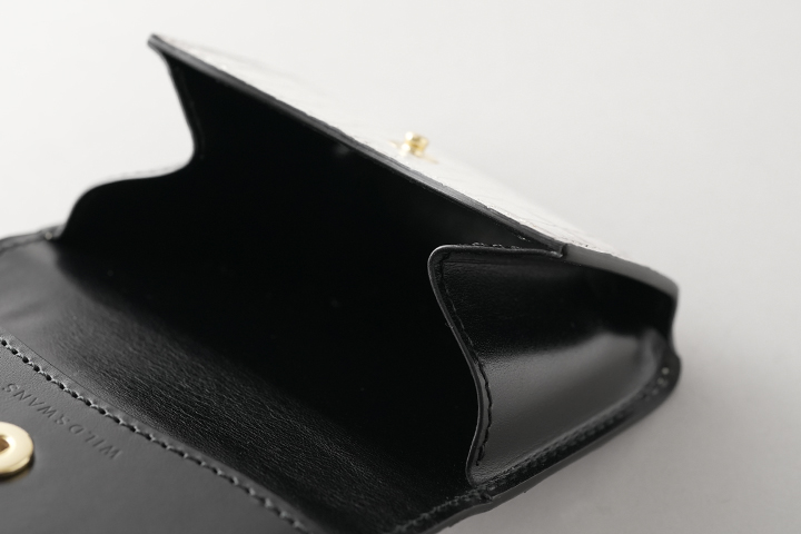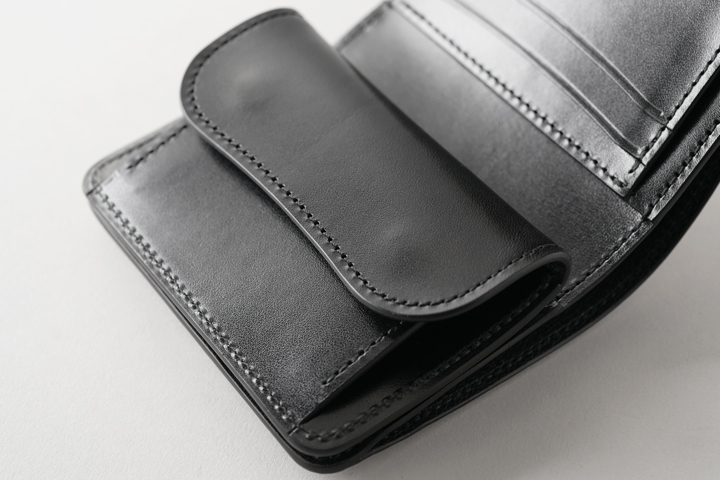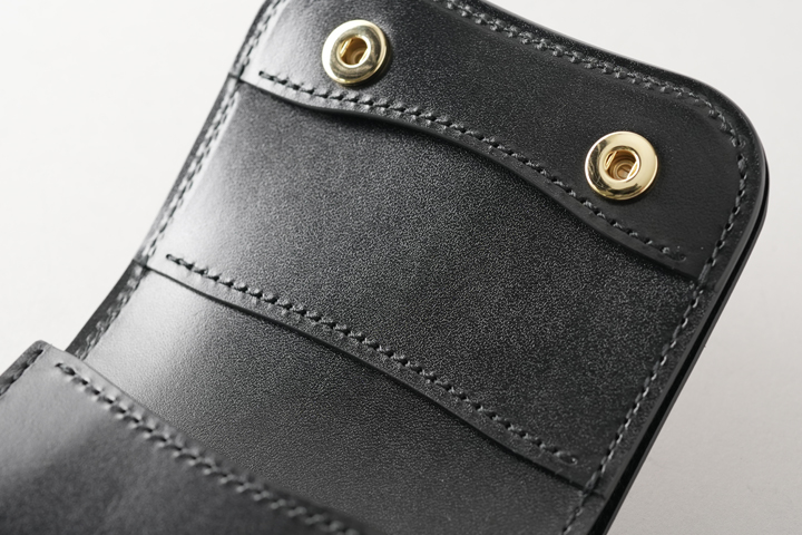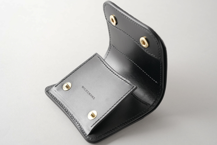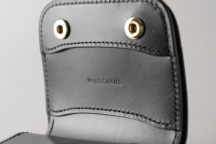 本体のフラップは1点のホックで留められているため、新品状態でフラップが閉じます。 これまでに製作されたWILDSWANSのカードケースはフラップにホックのないモデルが多くありましたが、ARTHURはホックがあることで最初からフラップがしっかりと閉じています。