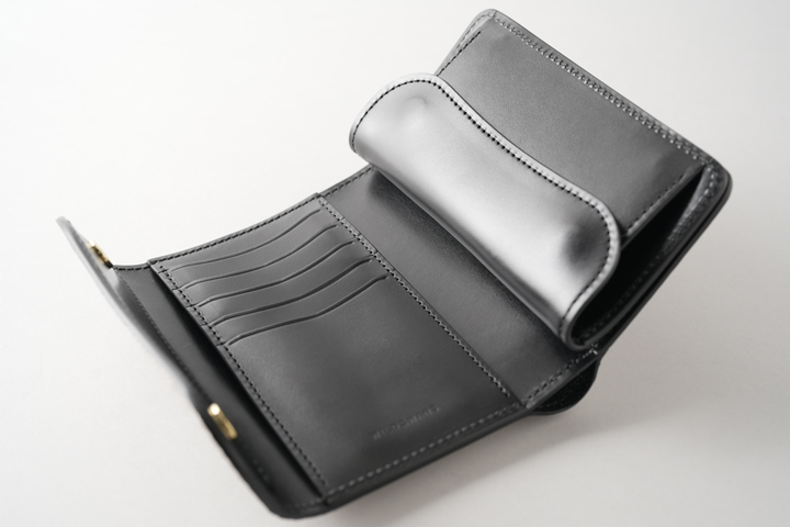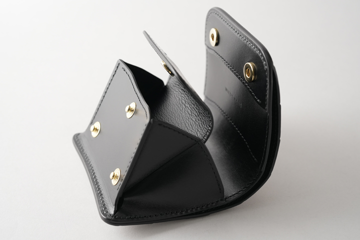 手のひらサイズの三つ折り財布、ENO。コンパクトですが立体的に配された収納部によって収納量も高く、機能的なモデルです。