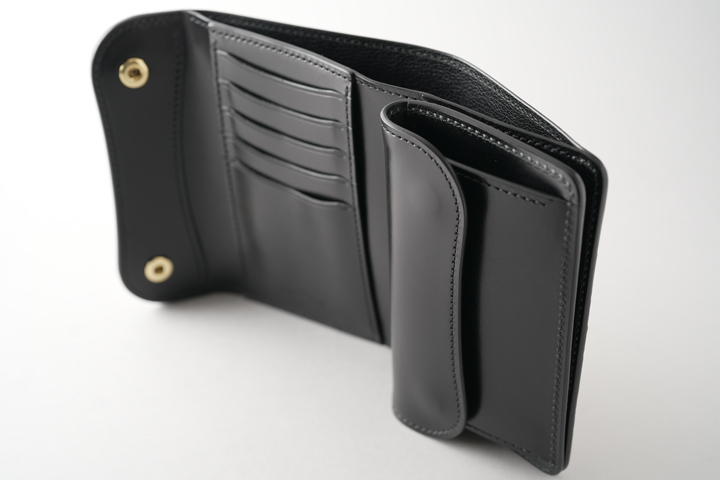 丸みを帯びた愛嬌のある見た目と同時に重厚感や存在感も強く感じる三つ折り財布、収納量は豊富で様々なものを収めて持ち運ぶことが出来ます。
