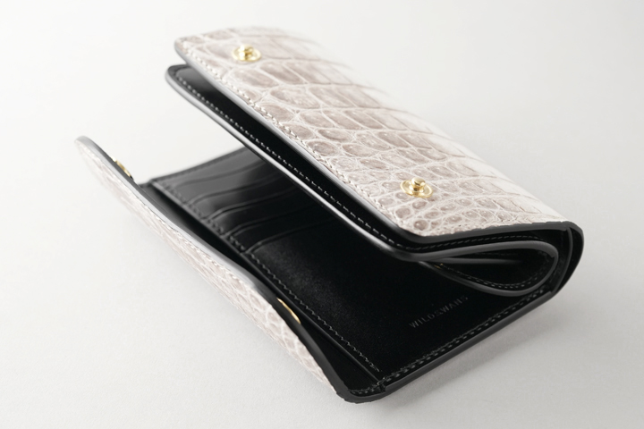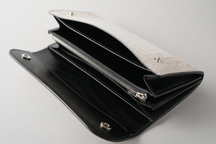 大容量でバリエーション豊かな収納部を備えており、非常に機能的な大型長財布・WAVE。 そして何といっても大判のヒマラヤクロコを使用していることで大変雰囲気のあるアイテムに仕上がっています。