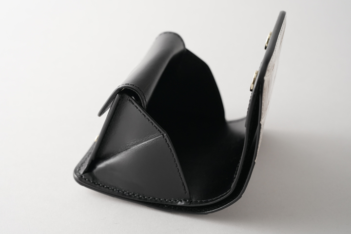 フラップを開けば内装はそのままコインケースになっています。両サイドにはマチが折り畳まれておりますので、ケースは手前に大きく開きます。