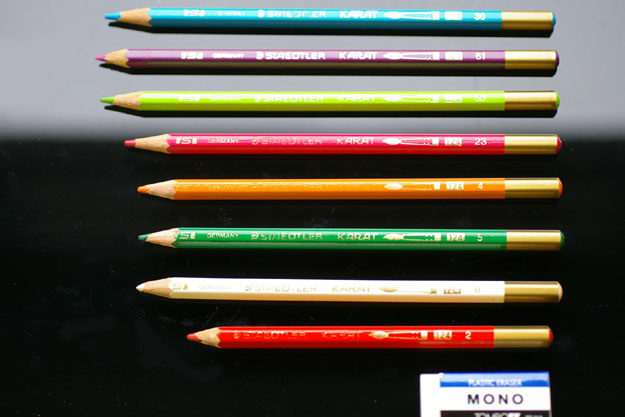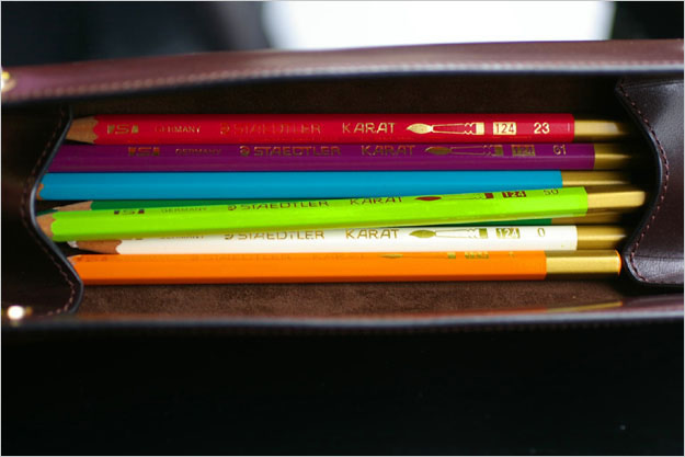 鉛筆を入れても良いのですが、勿論三色ボールペンでもBICのボールペンでも何でもありです。下の写真は試しにSTAEDTLERのカラーペンシルを入れてみたところです。