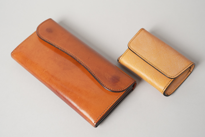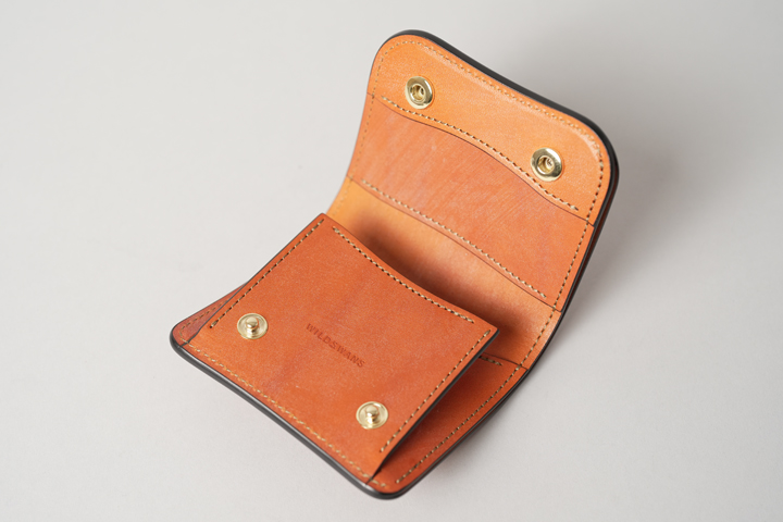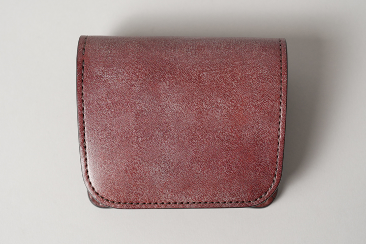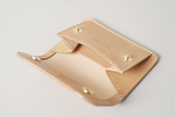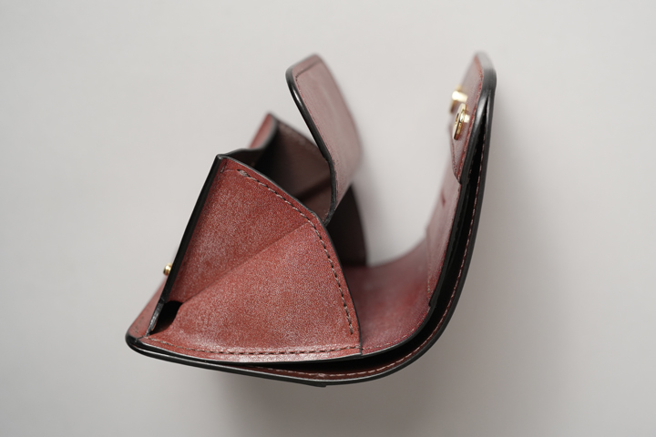 外装は切れ目のない1枚の革パーツで構成されており、フラップを開けば手のひらよりも大きいサイズになり、小型のアイテムながら革の表情を楽しむことができます。
