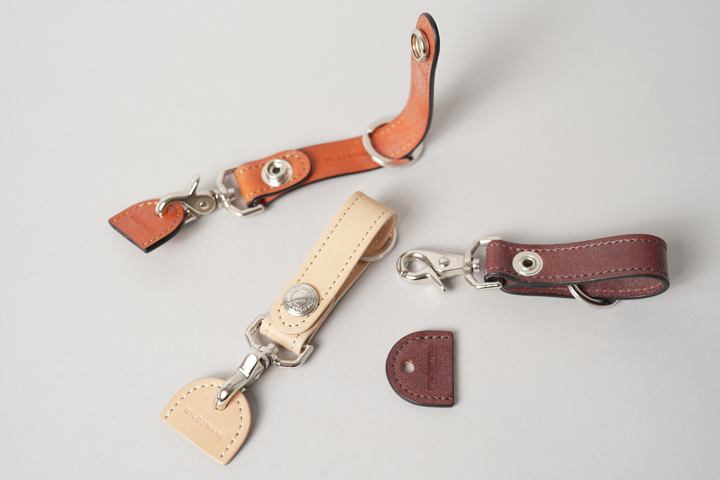 オリジナルホックやナスカンなど特徴的な金具が備え付けられたキーホルダーです。