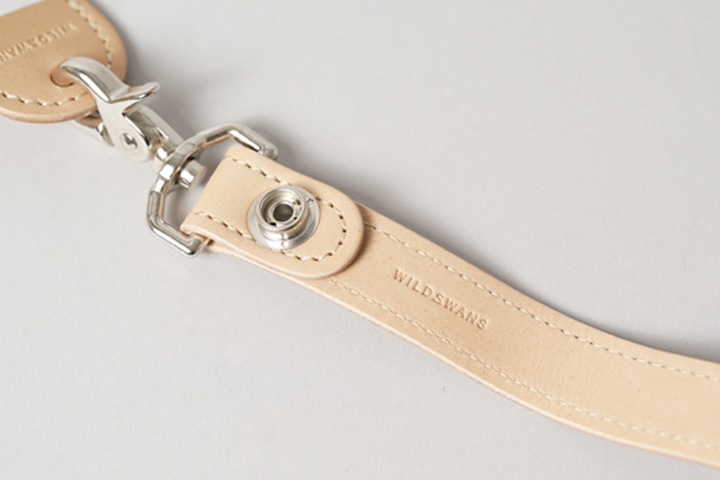 本体部分は1本の革の帯を折りたたみ、WILDSWANSロゴ入りの頑丈なジャンパーホックで留めています。