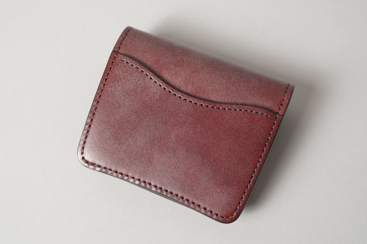 この後にご紹介させていただくコインケースのTONGUEと同程度のサイズ感ですが、大きく見た目が異なるのは背面ポケットの有無です。ARTHURはポケットが備えられておらず、つるんとした背面はフラップ~前胴に繋がっており、丸みを帯びたフォルムを形作っています。