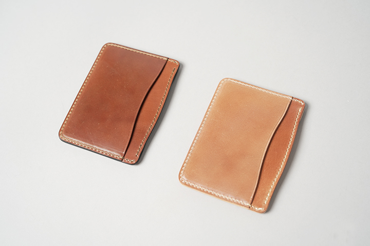 画像左はシェルコードバンのバーボン、画像右がナチュラルです。ナチュラルカラーとはいわゆるヌメ革と同義で、無染色ゆえに革表面にはシミ、傷、シワ、血筋、毛穴などが他のカラー以上にはっきりと見られます。色味としてはキャメル色や小麦色と表現されるような黄味を帯びたライトブラウンで、バーボンよりも薄く淡い印象を受けます。