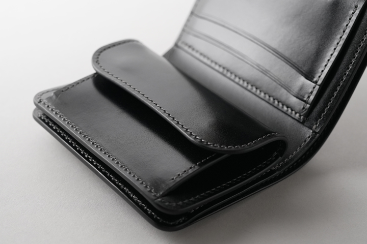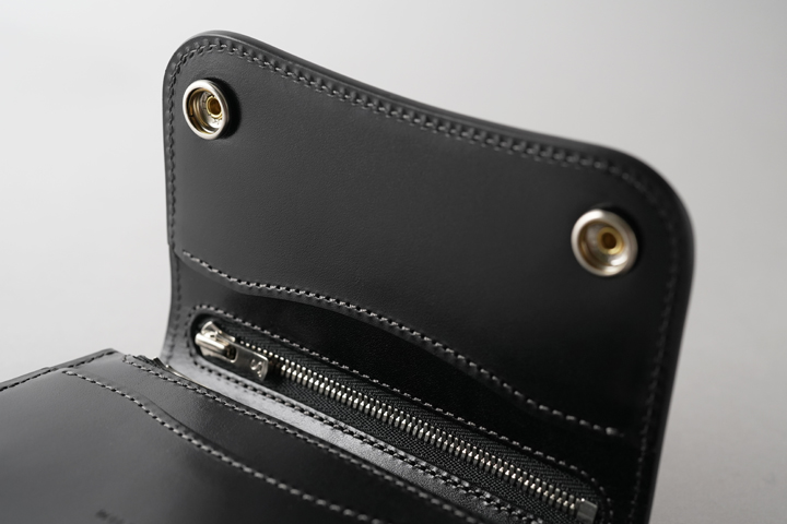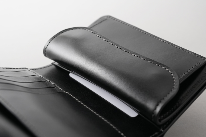 カード収納部の隣にはコインケースが取り付けられています。 フラップ式のコインケースは横長で、コインの収納枚数が増えても厚みが出にくい構造です。