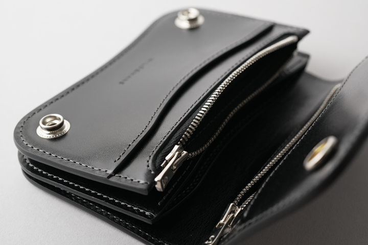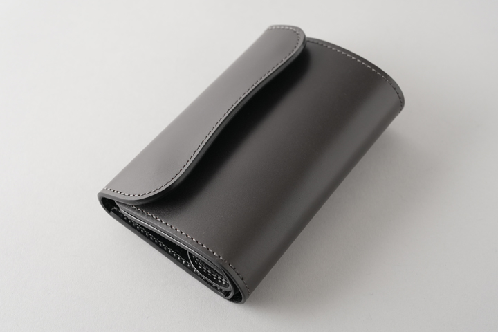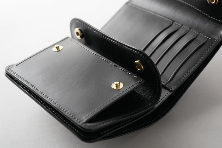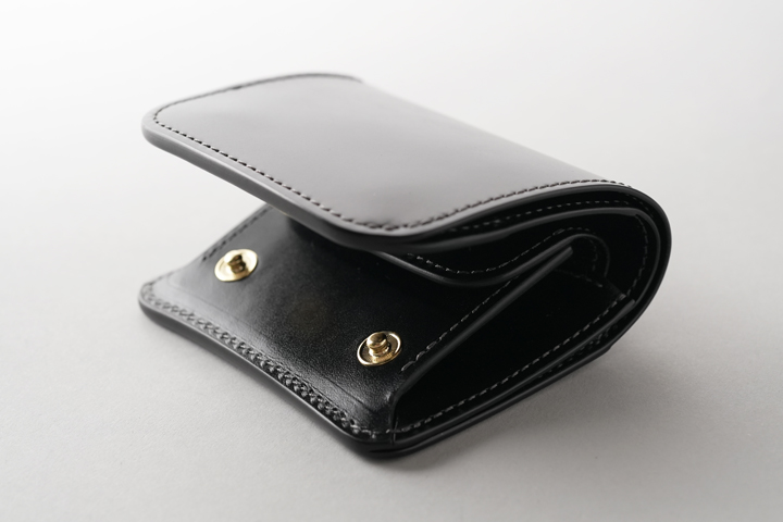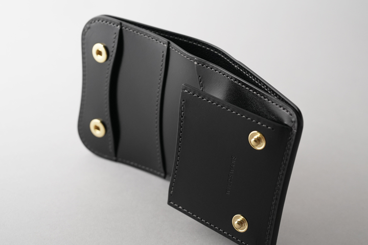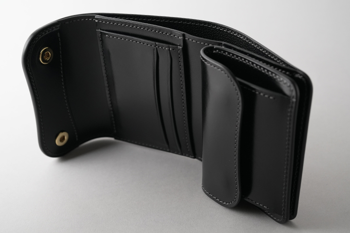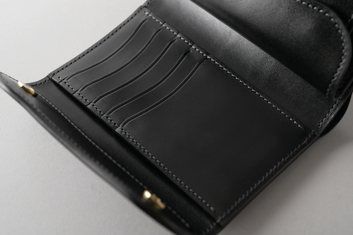 立体的に収納部を配置し、小さいながらも豊富な収納量を備えた三つ折り財布です。
