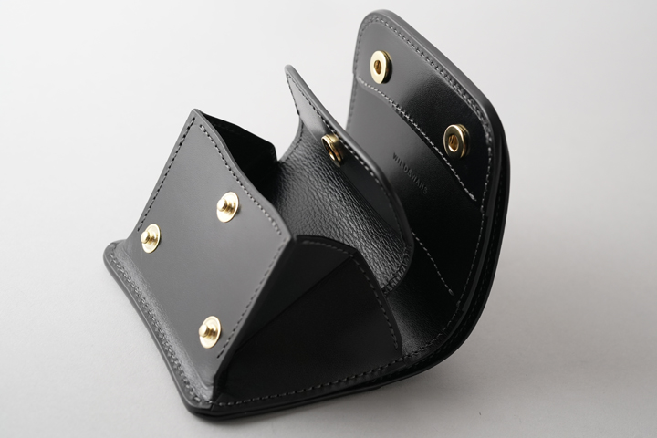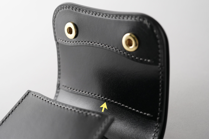 こちらはコインケースです。フラップ式のコインケースはカード収納部に対して垂直に取り付けられています。