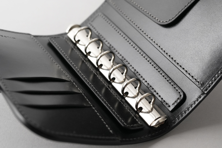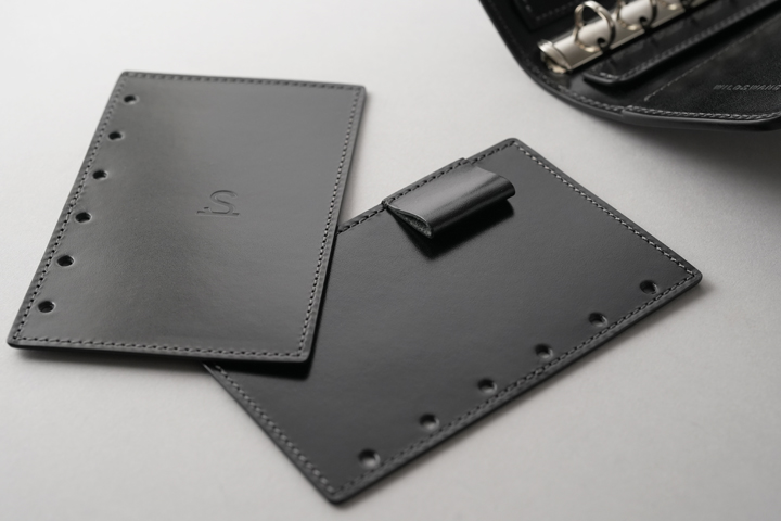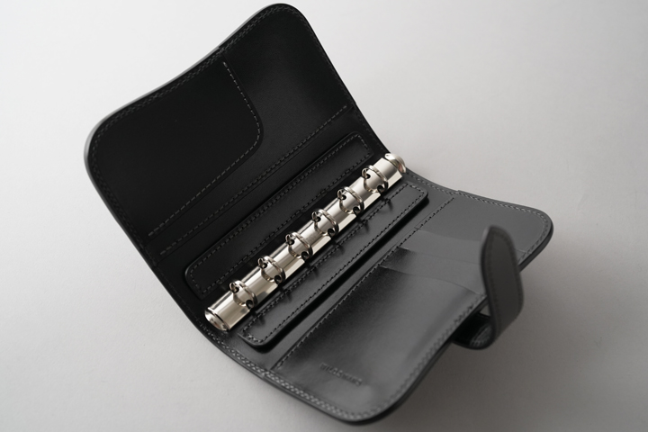 内装は中央にバインダー金具が取り付けられ、左右の表紙裏にはそれぞれ形状の異なる収納部が設けられています。