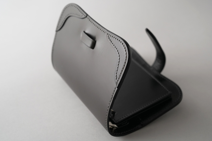 角の補強パーツや本体を閉じるベルトなど、どこか馬具を思わせるような雰囲気に加え、鈍い光沢を放つグレイのコードバンは金属のようでいつも以上の重厚感を感じます。