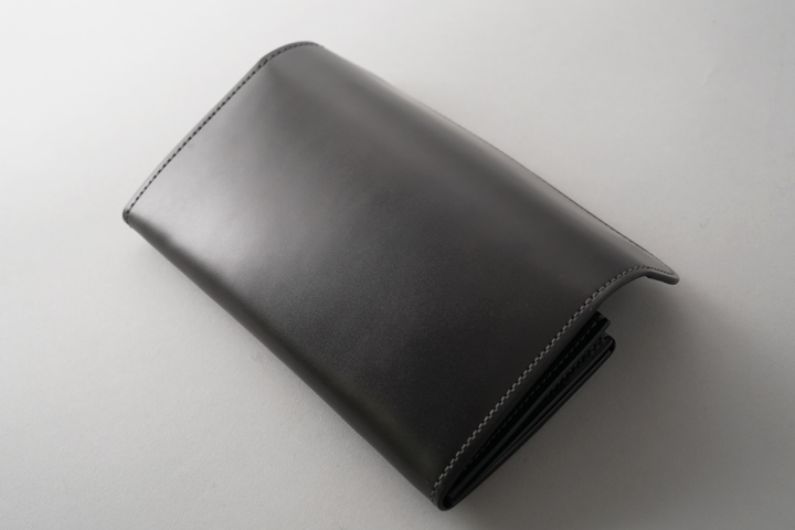 優雅な曲線のデザインが特徴的な、肉厚で堅牢な中型財布です。