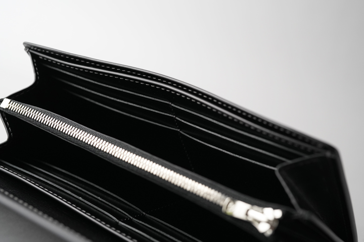 ファスナーポケットの奥にはマチなしのポケットが付属します。 それぞれのユニットは中央部分で縫い留められておりますので、手前に引くと開口部が大きく開きカードやレシート、2つ折りの紙幣などを収納することが出来ます。