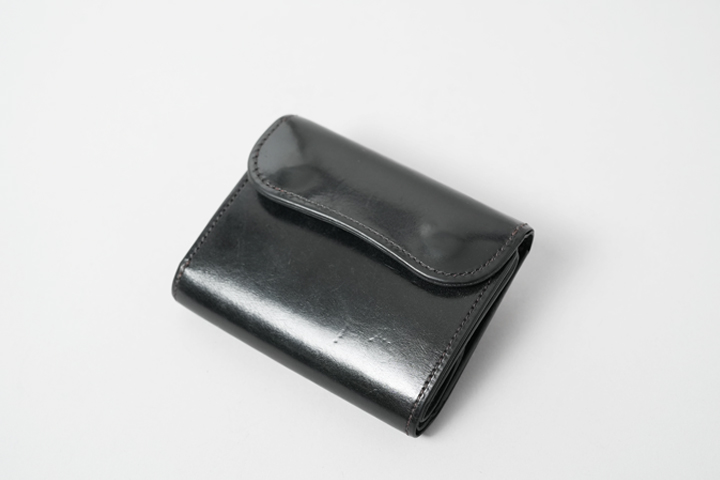 こちらはスタッフが約1年使用したサドルプルアップ/BLACKのENOです。使い始めのギラリとした光沢がさらに艶めきを増し、シェルコードバンに勝るとも劣らない力強い光沢を放っています。
