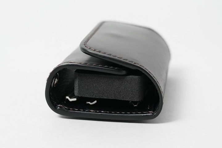 各シリーズについてご紹介したところで、ここからはDAKARの使用方法やディティールについてご説明させて頂きます。DAKARは鍵を包みこむタイプのベーシックなキーケースですが、スマートキーのような大きな鍵の収納も想定しています。そのため、フラップを閉じた状態でも中がぽっかりと空洞になるように設計されています。