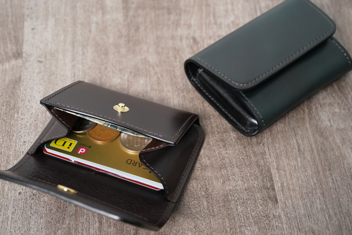 名刺やカードだけでなく、紙幣や硬貨までも収納できる万能型アイテムです。マチを通常よりも湾曲させることで、広い開口を実現しています。