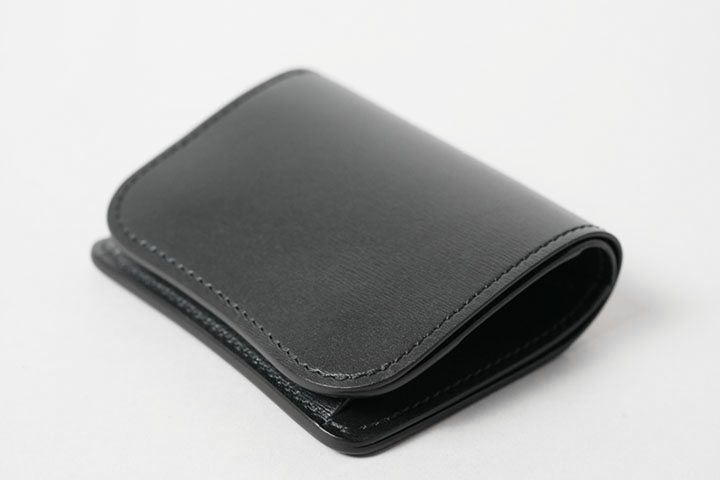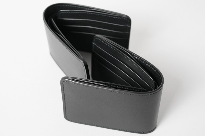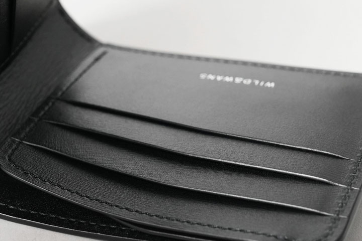 コインケース付きの二つ折り財布です。片側にはあおりポケット状に縫製されたカード収納部が備わっています。もちろん、こちらもWINGSと同様に一段ずつ裏貼りが施されています。