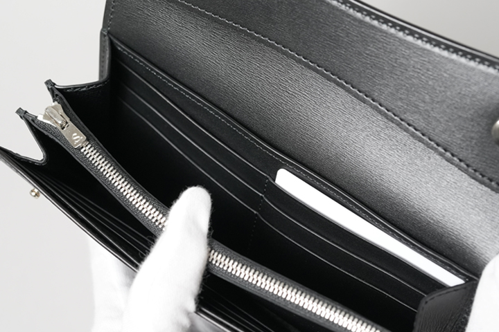 一枚革を活かした札室は、1万円札や長めのレシートを問題なく出し入れできます。広々としたスペースを備えつつ程よい深さに設計されていますので、ストレスフリーな使用感です。