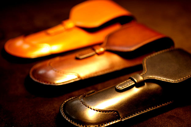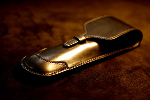 万年筆ケースの新作です。上の写真はベルギー産のサドルプルアップのブラックで作ったものです。サドルプルアップは本来、馬の鞍をはじめ馬具等を作る時に使用する革ですので、大変硬く堅牢に仕上がっています。
