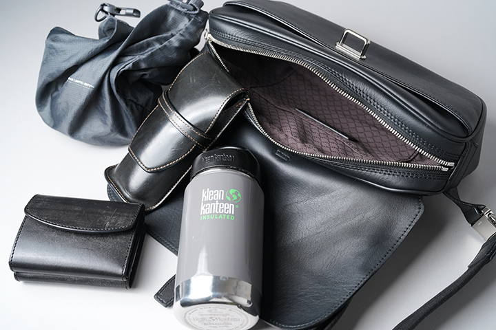 次にMONTPARNASSE / RIGID。SVELTOにも収納した財布(FERMORE)、ポーチに加えて、ペンケース(Peek A Boo4)、ステンレスボトル(355㎖)、そして本体前後のポケットにはスマートフォンも同時に収納が可能です。