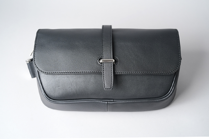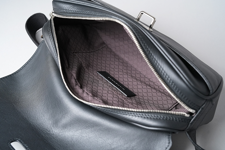 RIGID正面のフラップは、独特の方法で留められています。こちらの留め方は、本体中央に付いた金具にフラップのレザーストラップを差し込むだけです。先ほどご紹介したSVELTOも同様の仕様ですが、余程激しい動きが加わらない限り、フラップが開いてしまう心配はありません。むしろ操作が容易な分だけ、内装のメイン収納部へのアクセスを迅速に行うことができます。
