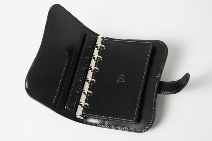 内装の左右はオープンポケット状に縫製されています。さらに左側にはあおりポケット、右側には三段のカード収納部が設けられ、名刺やカード、メモなどの収納に役立ちます。
