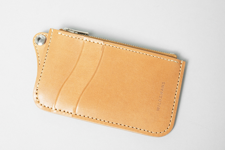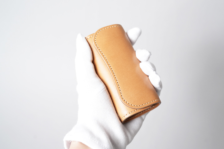 NATURAL(ナチュラル)。素朴なベージュカラーです。染色加工を施していないため、色味は5色の中で最も明るく、その分エイジングによる変化の幅も大きくなります。ステッチはライトベージュです。なお、これまでにご紹介した4色はコバを黒い染料で磨いていますが、NATURALの製品に関しては移染を防ぐために素磨き(染料なし)で仕上げています。