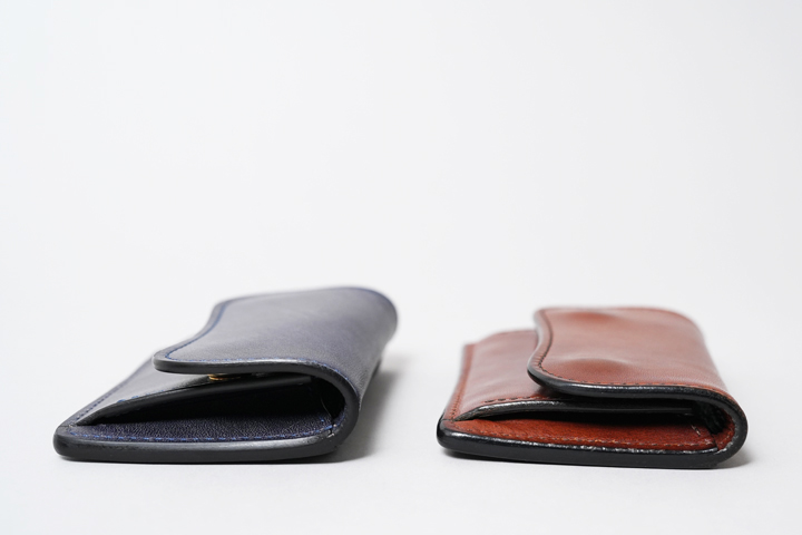 使用を重ねて革が馴染むことで、本体はややボリュームダウンします。画像の左側は新品のフルグレイン/TONGUE(ネイビー)、右は3年ほど使用したフルグレイン/TONGUE(ダークステイン)です。使い始めからコンパクトなサイズではありますが、時間が経つほどに手に馴染み、使用感と携帯性が高まります。