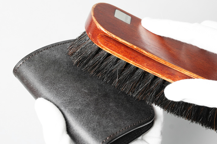 革表面に噴き出たブルームは、皮革内部に潤沢に油分が含まれていることの証明です。クリームやオイルの塗布はほとんど必要なく、むしろブルームが残っているうちに油分を加えると油染みのような症状に繋がる場合もございますのでご注意ください。ブルームはお使い頂く中で自然に落ちていくか、またはブラッシングや乾拭きによって徐々に減少します。そしてブルームに覆われさらりとしていた革表面は、その表情からは想像もつかないほどの劇的な変貌を遂げます。