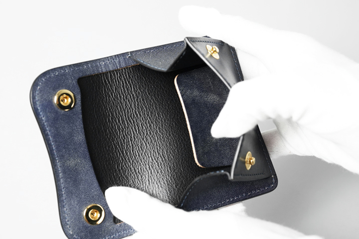 内装はベロパーツによって仕切られていますので、硬貨と紙幣、カードを分けて収納できます。ごくシンプルな構造ですが、それ故に場面を問わず活躍するアイテムです。