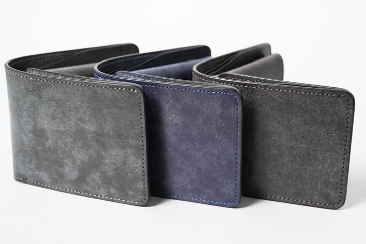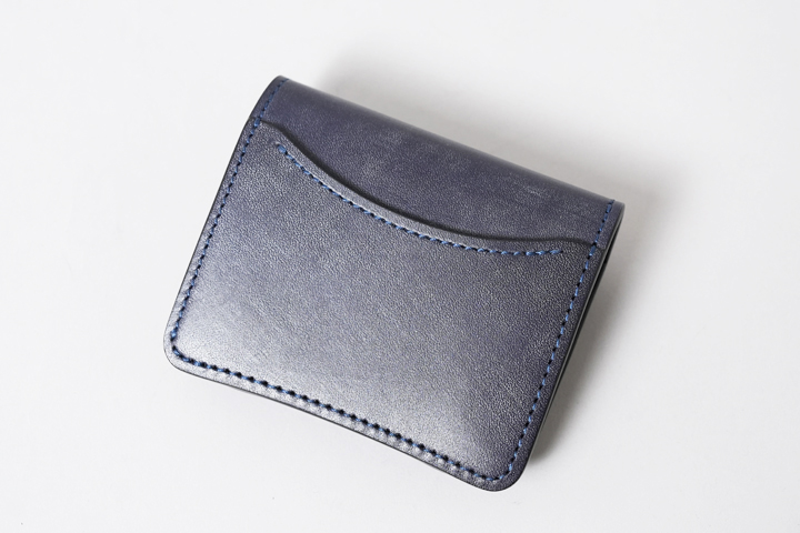 NAVY(ネイビー)。以前、「type2」と称して一般的なタンニンで鞣した同皮革のネイビーを発売しましたが、今回のネイビーはオークバーク鞣しで製造されているため、type2よりも深く落ち着いた発色で仕上がっています。普段はブラウン系のカラーが多く展開される中で、夜空のような濃紺が新鮮です。ステッチには同色のネイビーを使用しています。